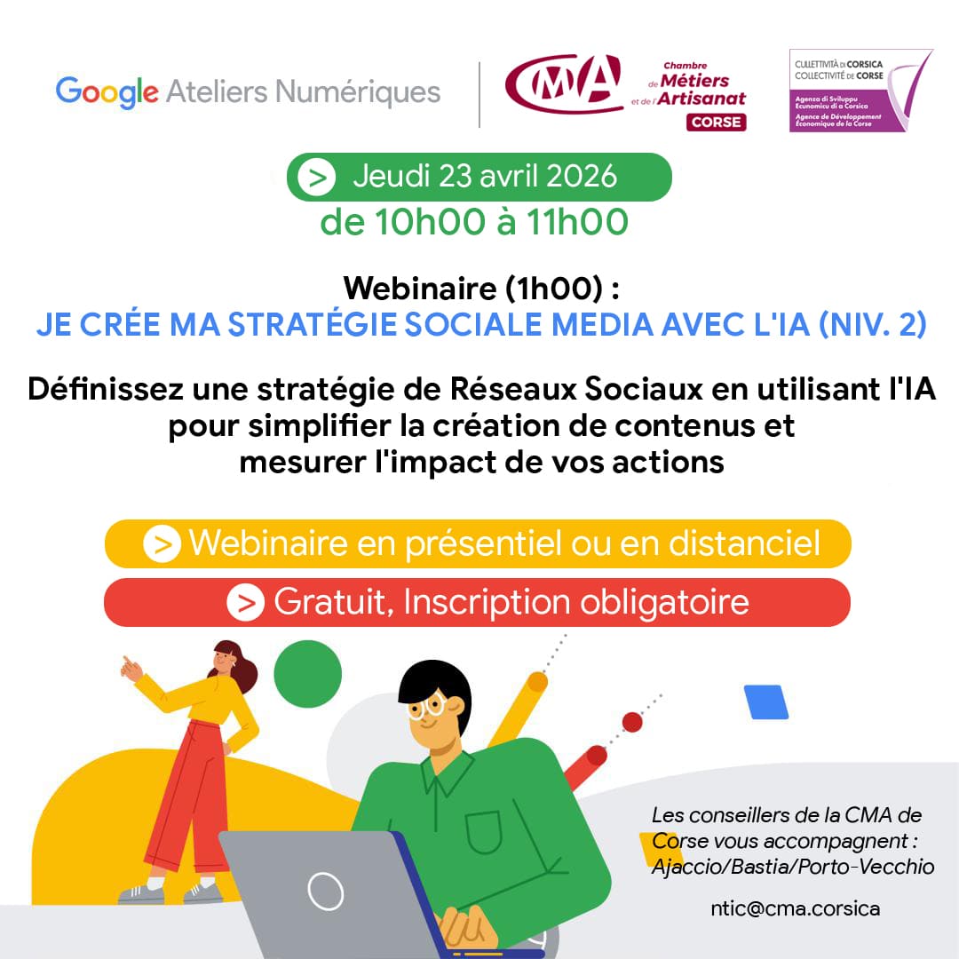 La CMA de Corse, en partenariat avec Google et avec le soutien de l'Agence de Développement Économique de la Corse (ADEC), vous propose un webinaire gratuit.
